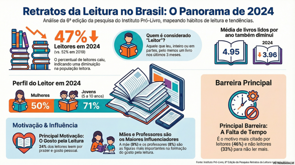 Todos os dados e infográficos apresentados neste artigo foram extraídos ou criados com base na 6ª edição da pesquisa “Retratos da Leitura no Brasil” (2024), realizada pelo Instituto Pró-Livro.