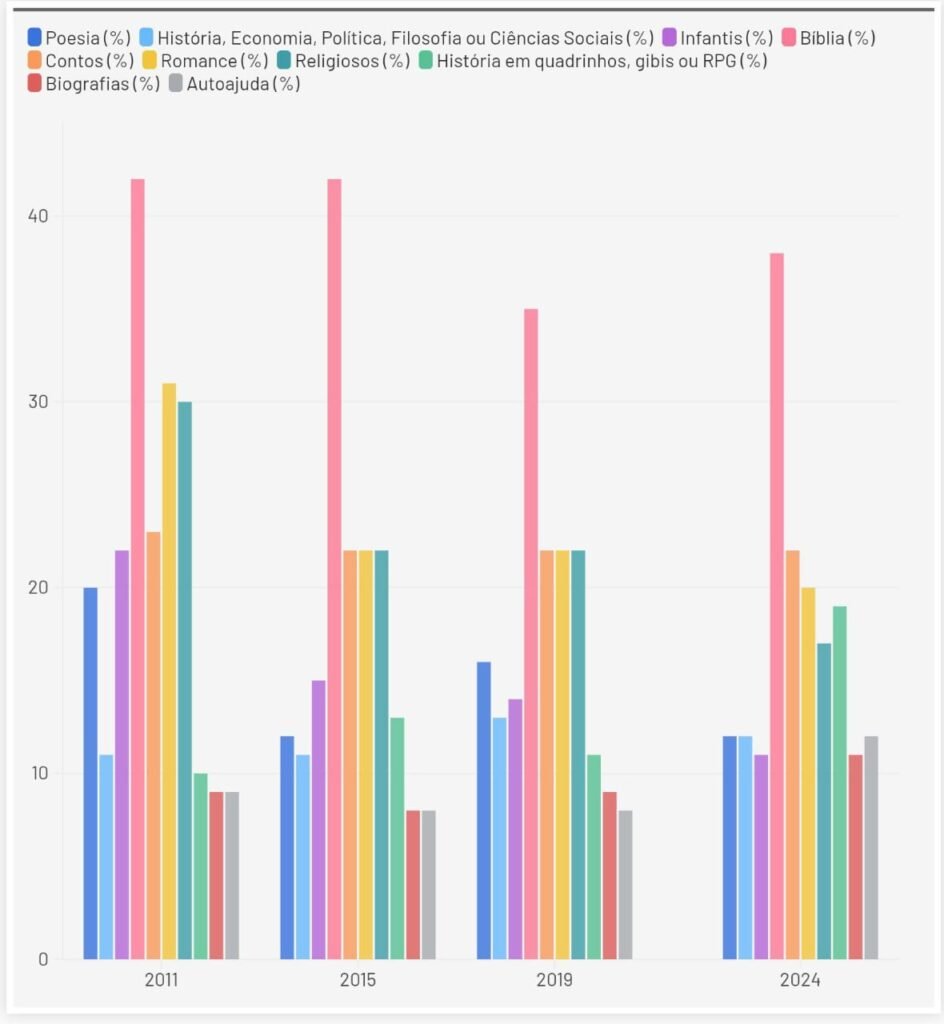 A liderança isolada da Bíblia não é surpresa em um país profundamente religioso. Mas o que chama atenção é a força dos livros religiosos em geral, que juntos representam 55% das preferências. Isso não é acidente — é reflexo direto das motivações de leitura dos brasileiros: crescimento pessoal (13%) e motivos religiosos (8%).